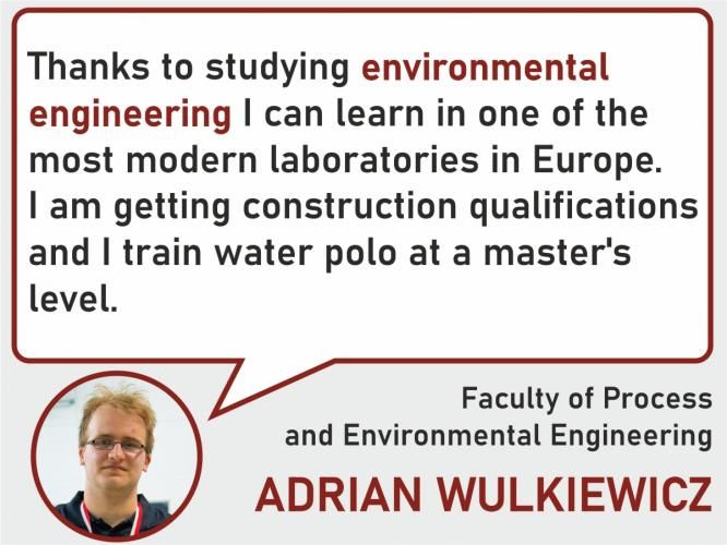 After the first year of studies I knew that if I put my mind to my studies, there will be a lot of opportunities for development. In addition to knowledge and a diploma, studying environmental engineering also gives you the opportunity to obtain building qualifications in a number of specializations: construction and building, installation in the field of renewable energy sources, networks and installations as well as heating, ventilation, gas, water and sewage equipment. With these qualifications, you can work in designing modern buildings. We can also design modern sanitary installations, air conditioning, gas pipelines and much more. And if someone does not like working behind the desk, they can work in the field, for example, when taking samples for analysis.