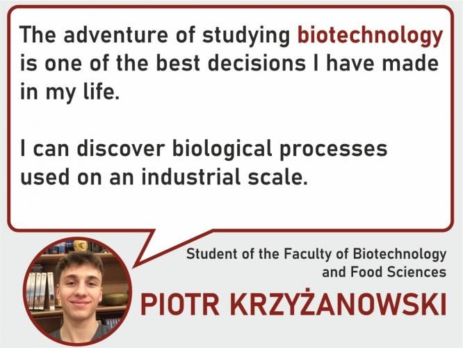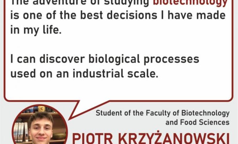 Studying biotechnology is one of the best decisions I have ever made. This course is a well-planned and balanced curriculum, discussing and implementing the latest technologies during classes, and a wide range of additional classes. Hundreds of hours spent in the laboratory, which have made me precise, methodical, and prepared me for my future career, are the most valuable things you can get by studying biotechnology. You can also choose an interesting specialization that will allow you to decide on the profile of your future work. If you feel that you will prove yourself in the role of a biotechnologist, do not hesitate and submit an application to the Faculty of Biotechnology and Food Sciences.
